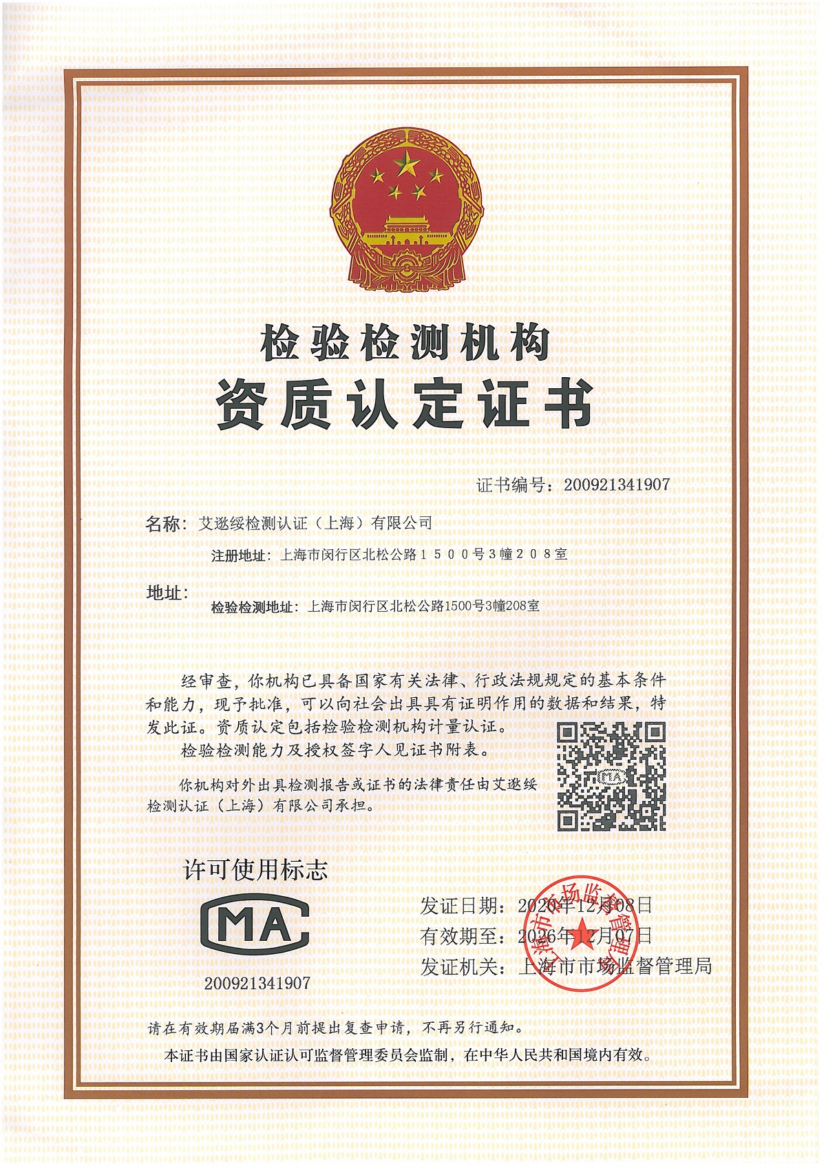 艾逖綏檢測認(rèn)證(上海)有限公司(以下簡稱 “ATC”)于2020年11月03日向上海市市場監(jiān)督管理局申請了實驗室CMA檢驗檢測。2020年11月20日上海市市場監(jiān)督管理局委托評審組對我司進(jìn)行了現(xiàn)場評審。我司順利通過了現(xiàn)場評審并于2020年12月08日拿到了檢驗檢測機(jī)構(gòu)資質(zhì)認(rèn)定證書(編號200921341907)。